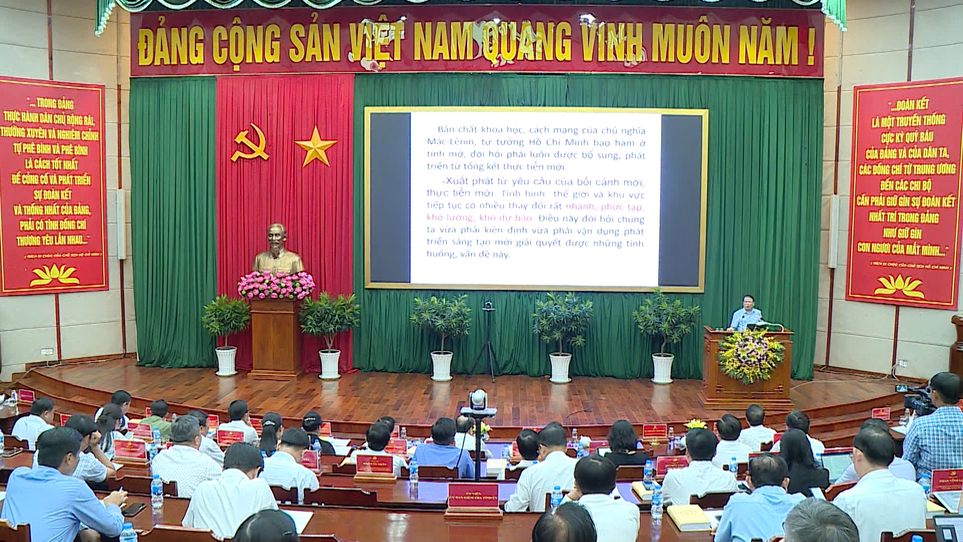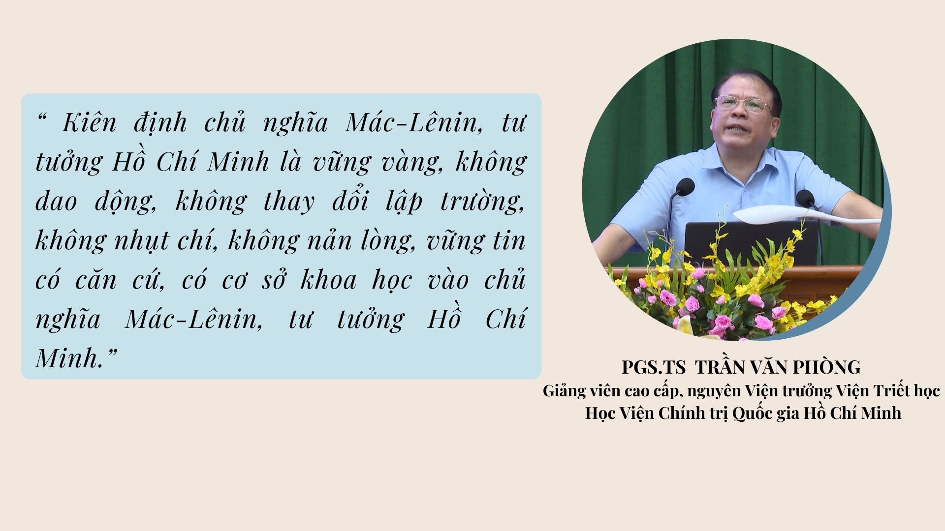 Giáo sư, Tiến sĩ Trần Văn Phòng, Giảng viên cao cấp, nguyên Viện trưởng Viện Triết học, Học Viện Chính trị Quốc gia Hồ Chí Minh truyền đạt cho cán bộ, Đảng viên và Nhân dân tỉnh Hậu Giang chuyên đề Kiên định và vận dụng, phát triển sáng tạo chủ nghĩa Mác-Lênin, tư tưởng Hồ Chí Minh.